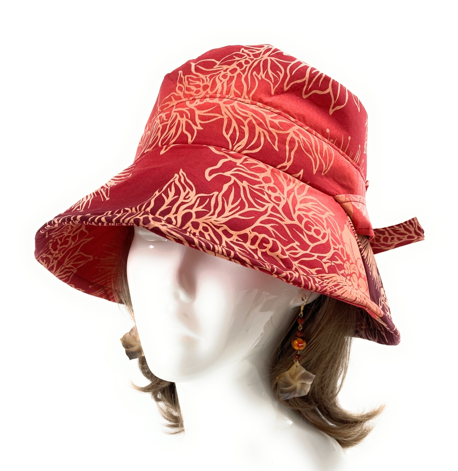 *デザイン:ハワイ直輸入のハワイアン・デザインプリント生地でデザインした、とてもお洒落なツバが広いキャペリンハットです。ボリエステル製のワイヤー入りなので型崩れしにくく綺麗なシルエットを保ちます。頭周りサイズは、内側の紐で調節できます。